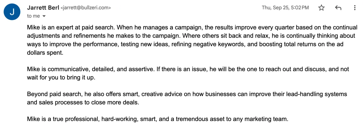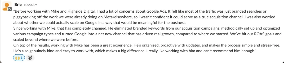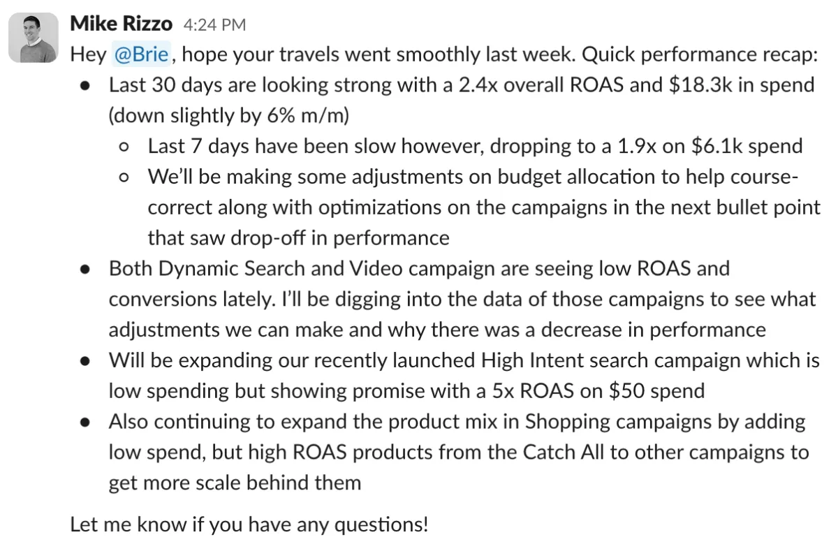 You will receive weekly updates in Slack that outline results, what we are working on, and what is upcoming. We will also schedule a recurring monthly call to go deep on strategy. If you have questions, give feedback, or just say "hi", we are available in Slack and respond within 1 business day (usually within an hour or two!)
