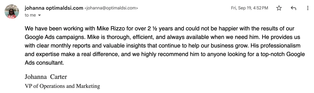 First step is to schedule a time for your free strategy session where we will review your goals and current marketing challenges. From there, we conduct a full account audit and review the results together within a week. At that point if we decide to partner, we'll schedule an onboarding call and account work and campaign optimizations begin immediately. From start to finish, this process usually takes 1-2 weeks.