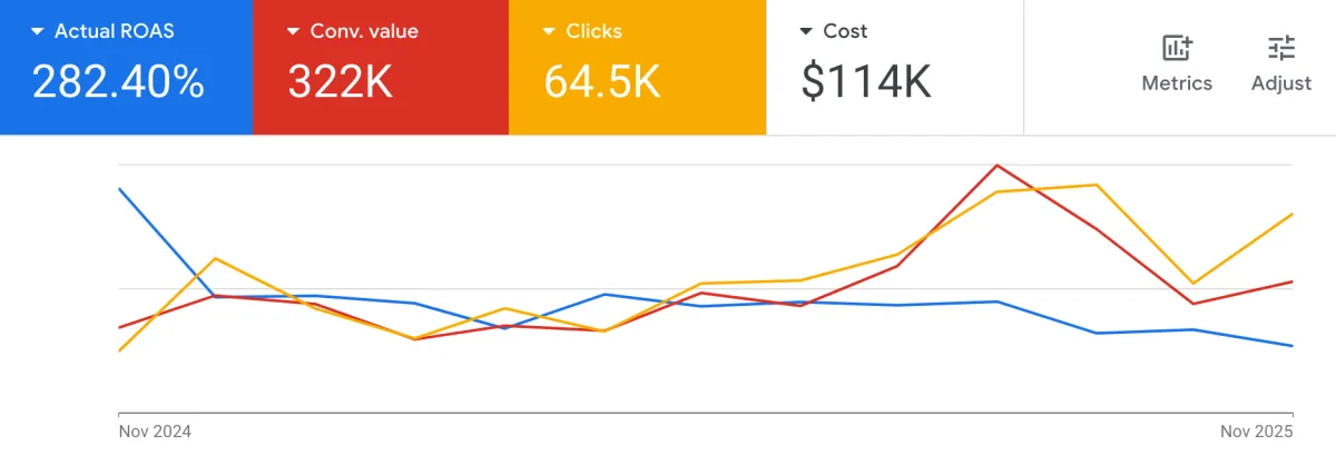 Relaunched Google Ads in Nov 2024 at $3,000/mo spend with goal of acquiring new customers outside of Meta Ads. Scaled up to $25,000/mo in spend while hitting ROAS Target of 2.5x and generating 1,382 new customers.